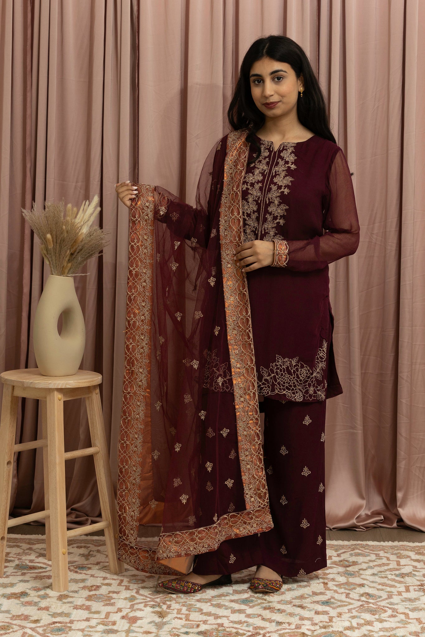 When combined with the embroidered, flared bootcut pants, it elevates the flow further. These wide trousers turn your ensemble into an all-encompassing delight of culture and abundance. And how could you ever forget the dupatta, this heavy and stunning piece of art. Albeit three pieces, they belong together.